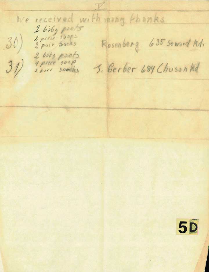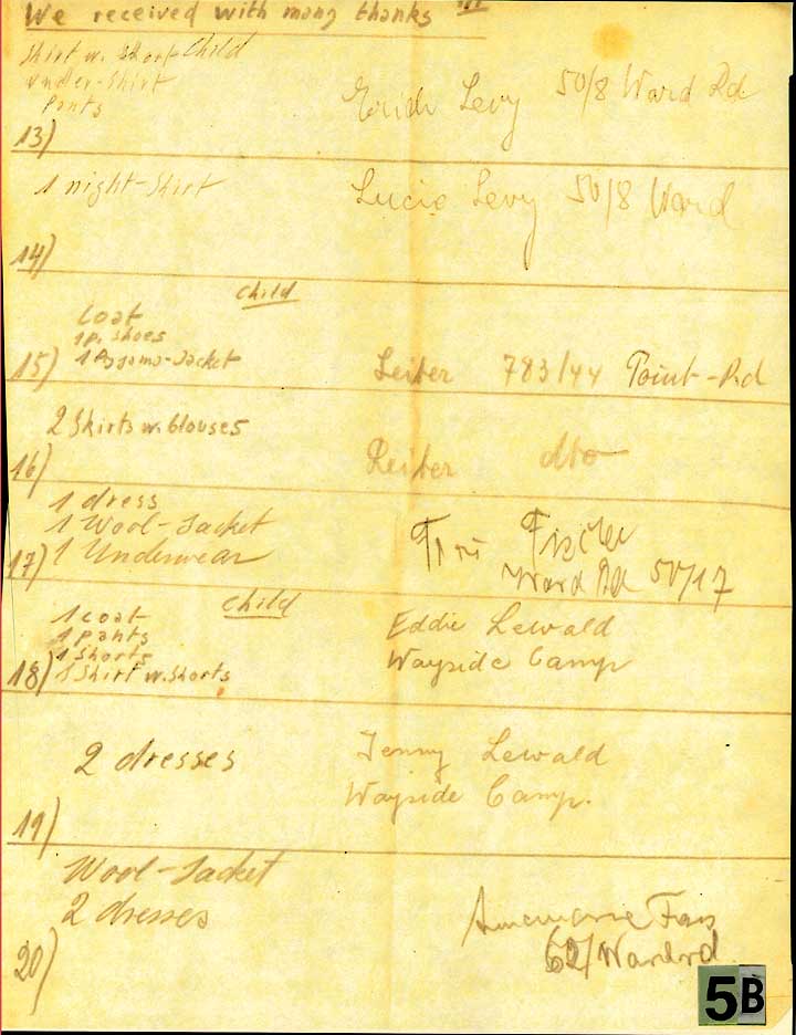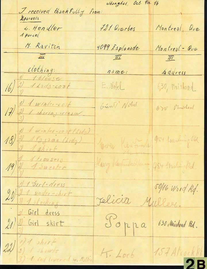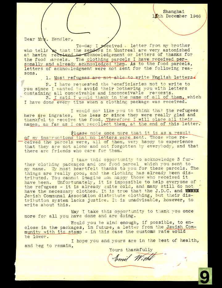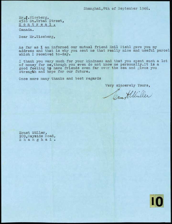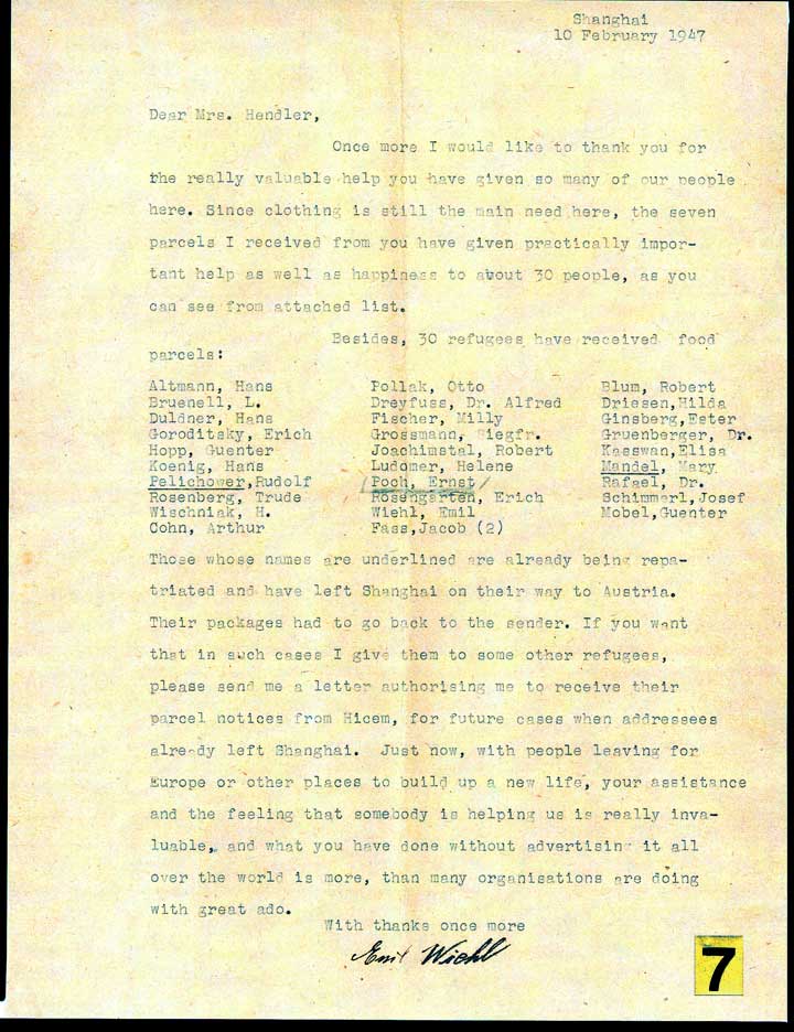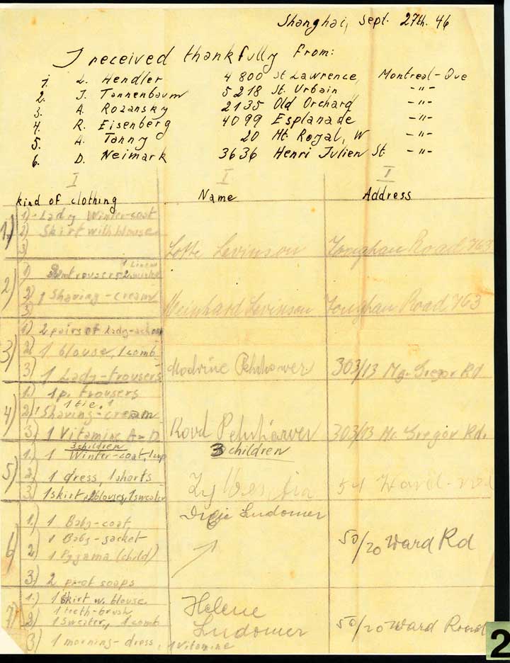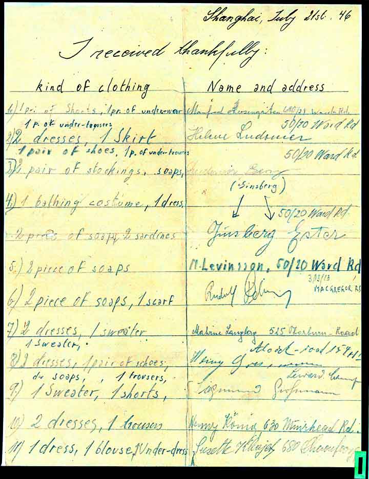 By Philatelic Judaica is a hobby that deals with postage stamps depicting the life and aspiration of Jews throughout the ages. It also includes important documents especially from the Holocaust era. Thanks to Ed Rosen, a fellow philatelist and stamp dealer in Redwood City, California, yours truly was able to obtain the following Shanghai memorabilia. The report that follows may hold a special interest to a number of Shanghailanders that were children at the time of their departure from Shanghai. They may not recall today the care-packages consisting of food and clothing their parents received from private citizens in Montreal, Canada. Several lists with actual signatures from the recipients acknowledging collectively the care-packages sent to them from Montreal, Canada are shown in Figures one thru six... The lists also state the item(s) received by the individual refugee, and their respective address. Names of Shanghailanders, alive today, that were youngsters when their parents emigrated to America or returned to their native country, also appear on a list. Sonja Muehlberger, now living in Berlin, who is popular among many Shanghailanders, especially for helping to locate the whereabouts or the fate of friends and relatives that immigrated to Shanghai prior to the war, is also shown by her maiden name on a list. Sonja was a small child at the time, and was represented on the list by her parents. After the war had ended, Emil Wiehl, an immigrant in Shanghai, corresponded with his brother in Montreal. With his help the Jewish Community in Montreal began to send care-packages to the refugees in the Shanghai Ghetto that were in need of food and clothes. Weihl, who lived at 50/20 Ward Road, and was also a recipient, acted as a trustee for receiving the care-packages and passing them on to the poor. At this point, it is assumed that Mrs. Hendler in Montreal was in charge of collecting the food and clothing from people in the Jewish Community and in sending them to Emil Weihl in Shanghai for distribution. The assumption becomes more evident in a letter sent to Mrs. Hendler by E. Weihl in February of 1947 in which he thanks her on behalf of all the refugees for the care-packages. The letter, shown in Figure seven, also lists another 29 recipients including Mr. Weihl. The envelope containing the letter and mailed from Shanghai, is shown in Figure eight. The reason for this particular method by which the gratitude for the care-packages and individual items was expressed, i.e. not directly from each individual but instead by signatures and by proxy, was explained in a letter from Emil Weihl to Mrs. Hendler. The letter is shown in Figure nine. Accordingly, most refugees were not able to write in English. Furthermore, Mr. Weihl was under the impression that a number of refugees may have swamped the caring people in Montreal not only with letters of thanks, but also with unreasonable requests. It was therefore, he added, that the people were asked to refrain from expressing their thanks individually, and that the letters containing the list of signatures would speak for all. There were some exceptions, however, like the letter sent from Mr. Ernst Mueller, to Mr. J Wiseberg in Montreal. The letter, written in September of 1946, is shown in Figure ten. Yours truly calls to the attention the command of the English language possessed by Mr. Mueller at the time he wrote the letter in the mid-forties. A similar letter sent by Siegmund Bruenell, 603 Tongshan Road, to L. Roskies in Montreal, is shown in Figure 11. In one of his later letters to Mrs. Hendler, E. Weihl wrote that food is no longer a problem because of the distribution of UNRRA rations. He also suggested in a letter to Mrs. Hendler, dated April 8, 1947, that all future care-packages should be diverted to Europe where the need for such items as clothes and food is far greater.