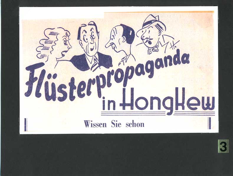 Chusan Road was the place to go to learn about what people were saying about other people. It was also the street where one could hear the latest "Bonkes" (rumors), here illustrated by way of a cartoon in figure three.