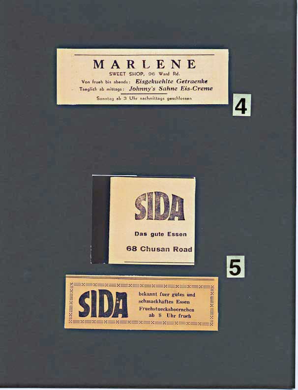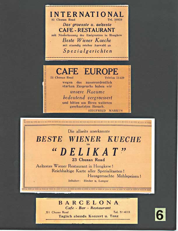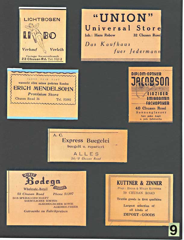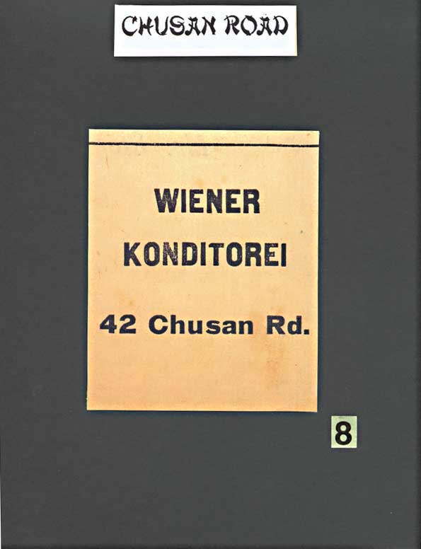 And who could forget "Die Wiener Konditorei" (figure eight), located at the heart of Chusan Road, where refugees, able to afford the mouthwatering pastries, spent their afternoon Kafeklatsch. Sahn Baiser, Schweine Ohr, Bienen Stich, and Pariser Spitz, their specialty, were among the wide assortment of Viennese pastries offered to their customers. Advertisements of different kind of stores on this particular and popular block called Chusan Road are illustrated in figure nine.
