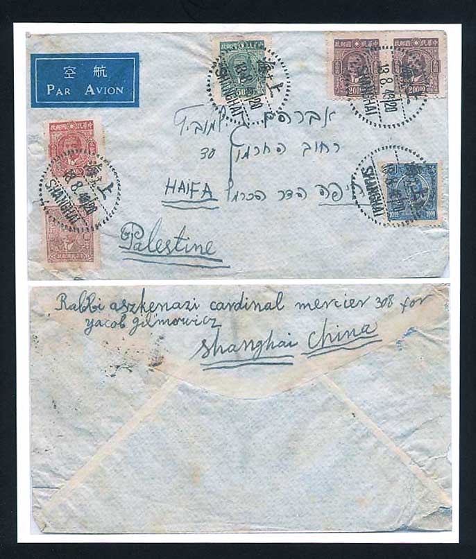 The five stamps on the envelop with a portrait of Sun Yan-sen were issued by the former Republic of China (ROC) in the year 1945 and 1947, a time when a large contingent of Jewish refugees from Europe and Central Asia were still living in Shanghai. As a reminder, the ROC governed all of China before it lost control of the mainland in 1949 to the People’s Republic of China (PRC).