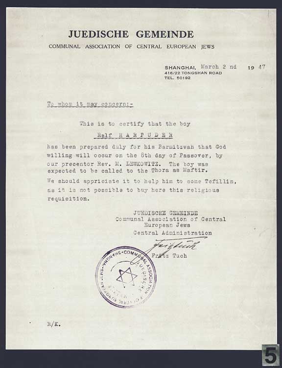 Perhaps less known to Central European Jews at the time was Rev. M Lewkowitz, known within the circle of the American Joint Distribution Committee as a hard working assistant administrator, and educator. Among one of his tasks was preparing boys for their Bar Mitzvah. In figure five we see a certificate issued by Rabbi Lewkowitz to yours truly stating that his student has successfully completed the Bar Mitzvah studies. The Bar Mitzvah ceremony took place a month later in my new country, at a synagogue in Los Angeles to a crowd with standing room only. There was not a dry eye among the throng of congregants when that frail little boy from the Shanghai Ghetto recited completely the Maftir and Haftahra prayer; a true testimony to how much our spiritual leaders gave of themselves for the youngsters to maintain and practice our Jewish heritage.